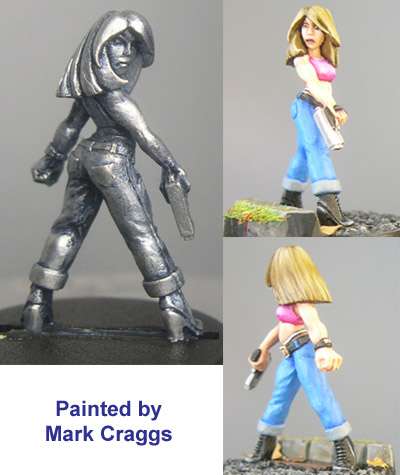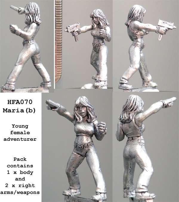Noch eine weibliche Abenteurerin. Pistole, Cargopants und bauchfreies Top. Sehr schön für Gegenwart, Polizei- und Cyberpunkspiele.