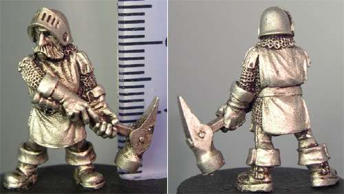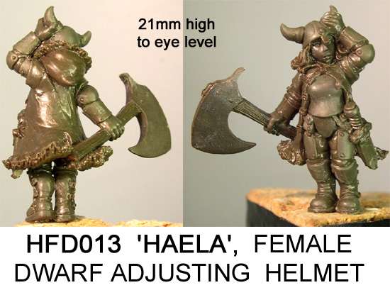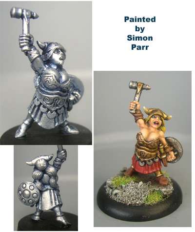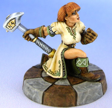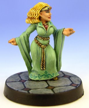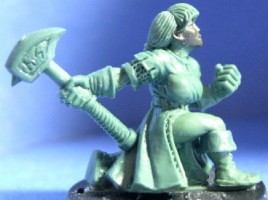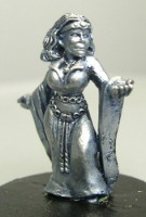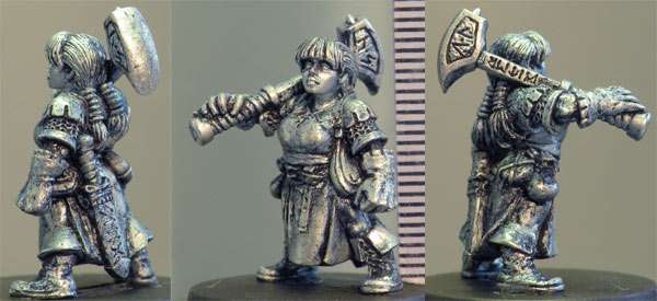 Ein sehr seltenes Motiv - Eine Zwergin in zivil, ohne Rüstung Bart und große Axt. Man kann dieses Modell sehr schön als Priesterin, Magierin oder Prinzessin einsetzen. Wenn sie Kevins üblichem Grymn-Maßstab folgt, d.h. sie ein wenig kleiner und schlanker ist, als ein GW-Zwerg, kann man sie sicher auch als Gnomin oder Halbling verwenden.