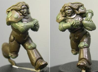 Libby als Blocker - Ich persönlich finde der Figur sieht man noch zu sehr den Science-Fiction Hintergrund an, als daß man sie einfach so in ein Fantasy-Team stecken könnte, aber es gibt ja auch Science-Fiction Varianten des Themas. Auffällig ist auch hier, daß Kevin sehr oft dynamische Posen wählt und die Figuren "in Action" zeigt. Figuren anderer Hersteller wirken dagegen oft ein wenig steif.