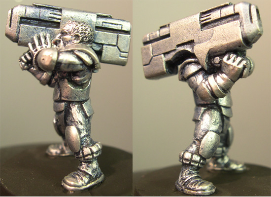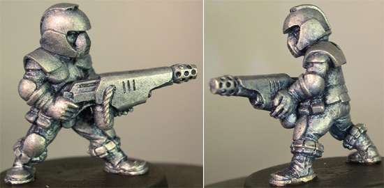 Endlich bekommen eure Grymneinheiten die nötige Feuerunterstützung. Den Anfang macht der MG-Schütze Horgan. Wie auf den Fotos zu sehen ist, wird die Minigun durch ein gryrostabilisiertes Tragegeschirr abgestützt, so daß Horgan auch aus der Bewegung heraus gezieltes Sperrfeuer geben kann. Irgendwie erinnert mich die ganze Figur an eine komprimierte Version von Private Drake aus dem Film "Aliens". Vielleicht bekommen wir dann in Zukunft auch noch eine "Vasquez" dazu...