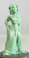 Noch ein Modell aus der Reihe "Bewohner der Großstadt". Das Modell ist recht allgemein gehalten, so daß man es vielfach fpr Dioramen und Szenarien einsetzten kann. Für SF und Cyberpunk-Spiele nimmt man sie z.B., als Passantin, Discomaus, Straßenmädchen, Prominente oder Girlie. Man kann sie aber auch neben das Barmädchen und den Tavernenzwerg stellen.